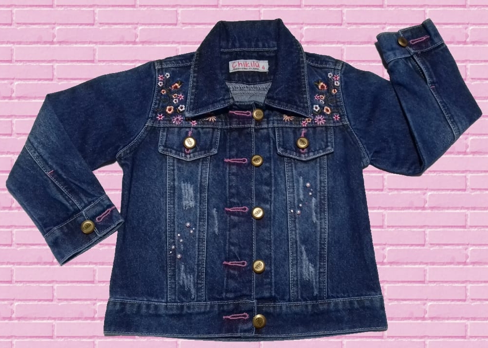 Diseño en bordado con perlas y piedras en combinación con los ojales. Tela fresh denim. Colores azul y celeste.