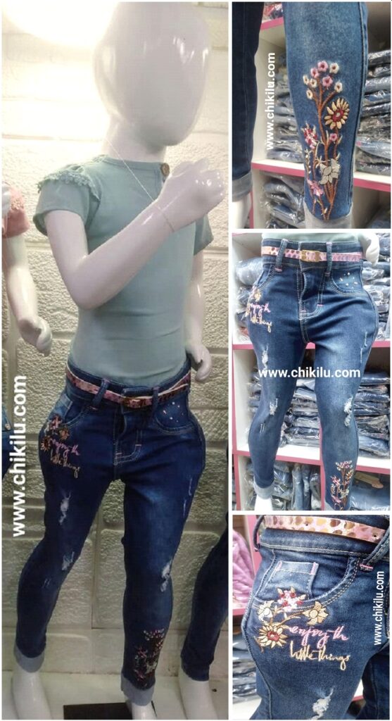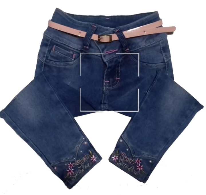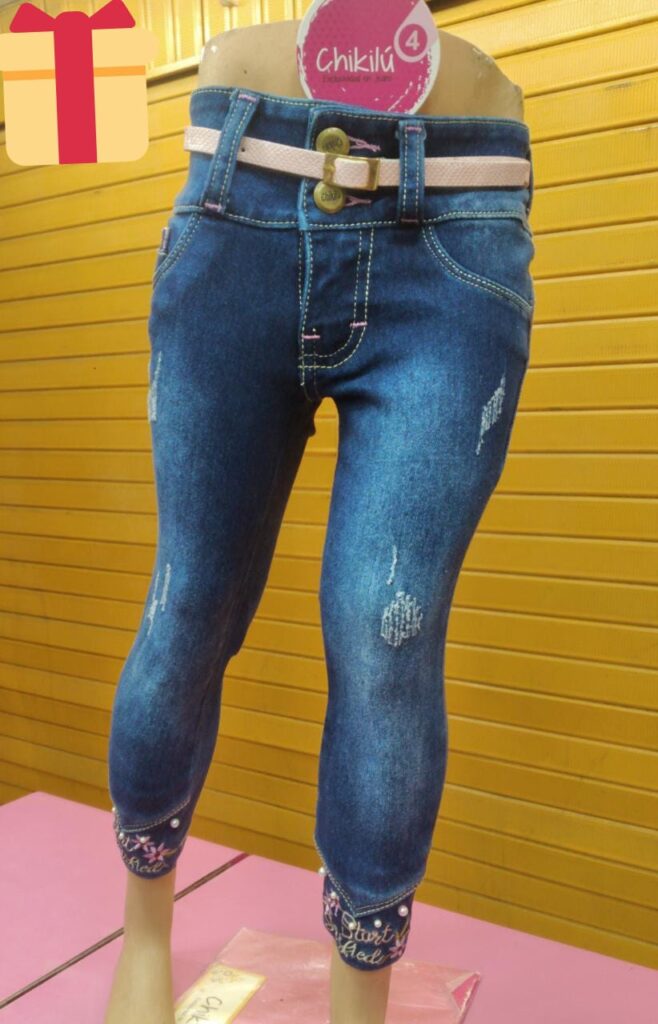 Pantalón con correa, fresh denim, bordado, con aplicación de piedras y perlas. Colores azul y celeste.