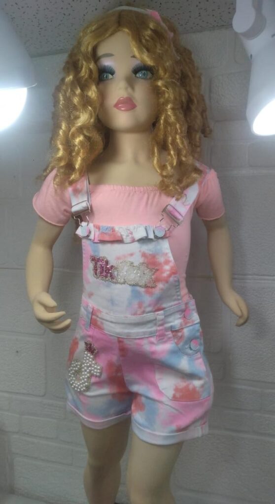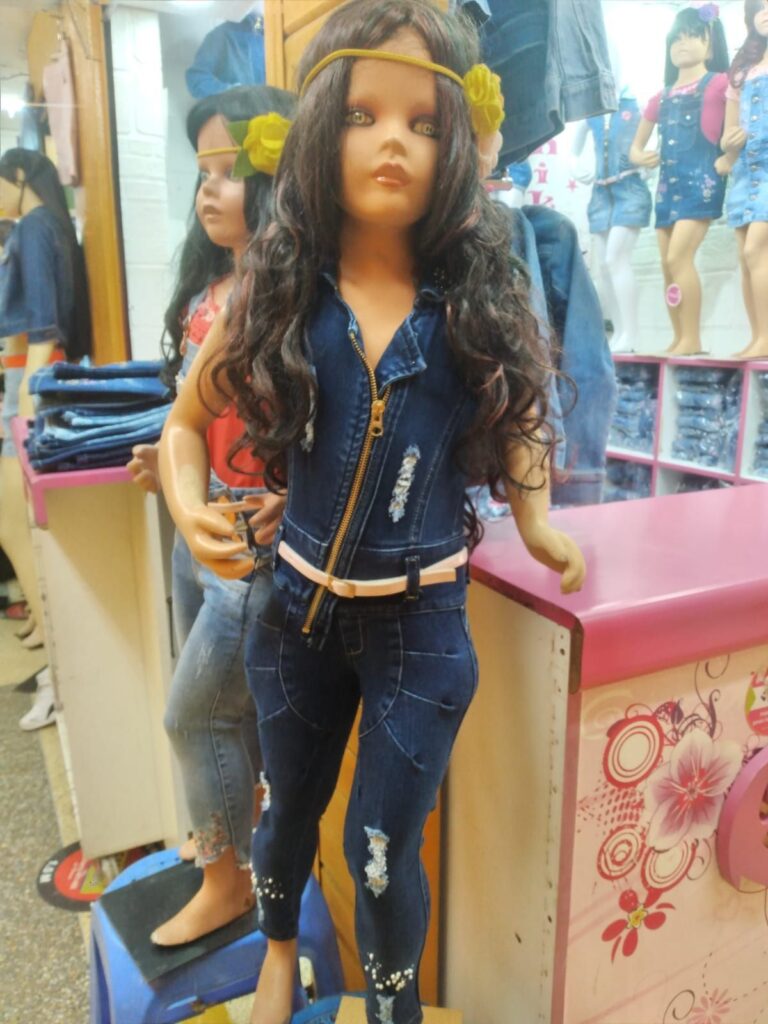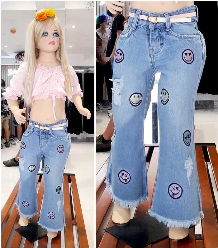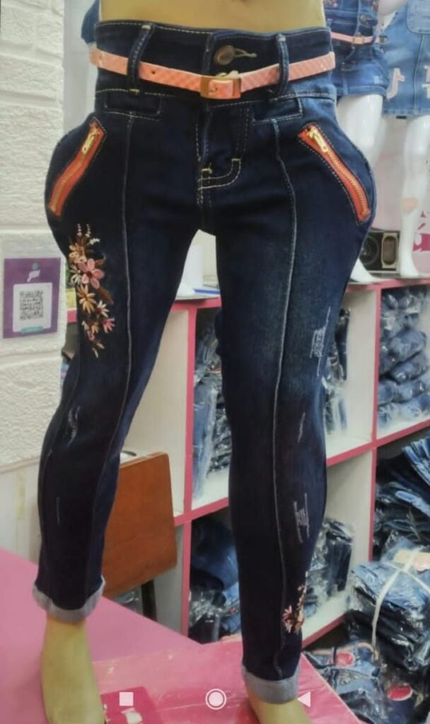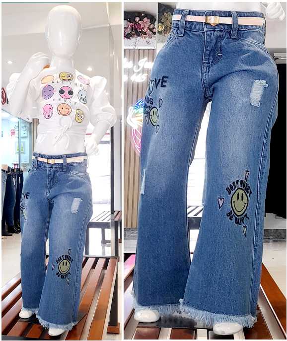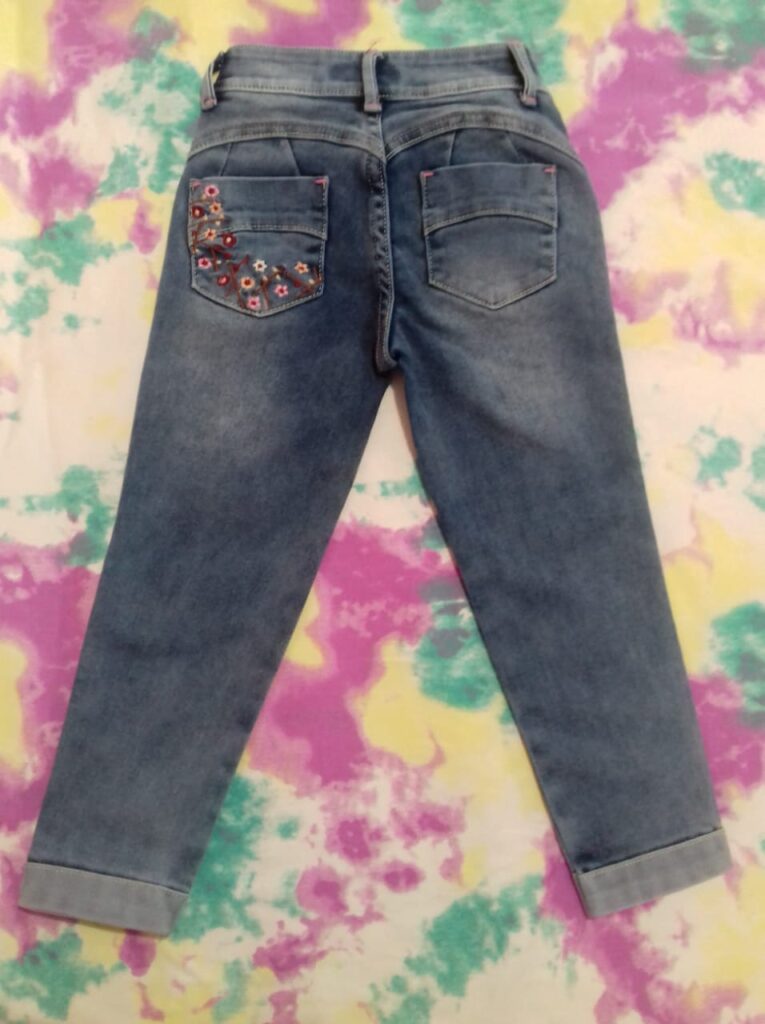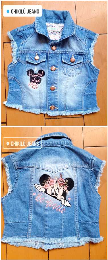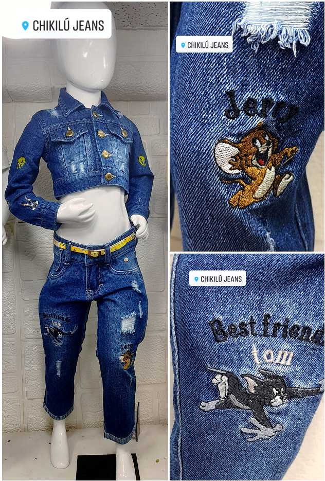 Denim rígido. Combina muy bien con el chaleco oversize con los mismos personajes. Si desea puede hacer su pedido de pantalón junto con chaleco. El chaleco va de las tallas de la 4 a la 14. Consulte la disponibilidad en talla y colores.