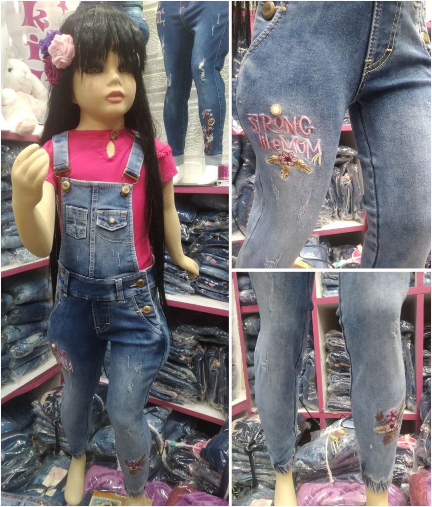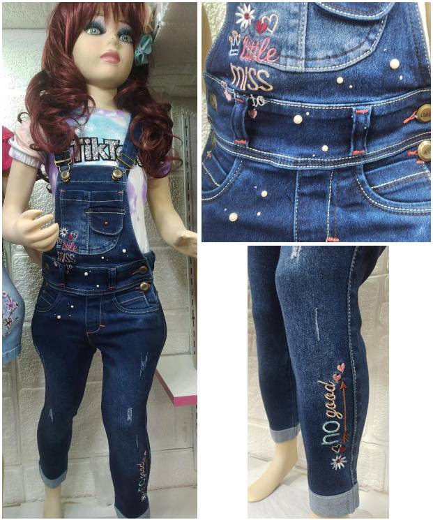 Pantalón Overol, tela fresh denim, aplicaciones en perla con piedras, bordado en pecho, tobillero. Colores azul y celeste.