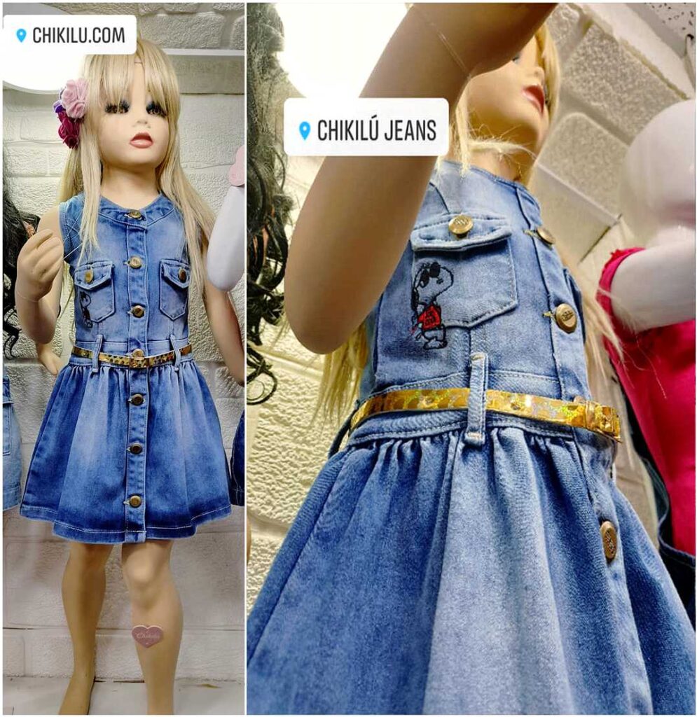 Vestido jean, tela fresh denim, aplicaciones con perlas, piedras. Incluye correa, botones de la marca. Colores: azul, celeste, maiz.