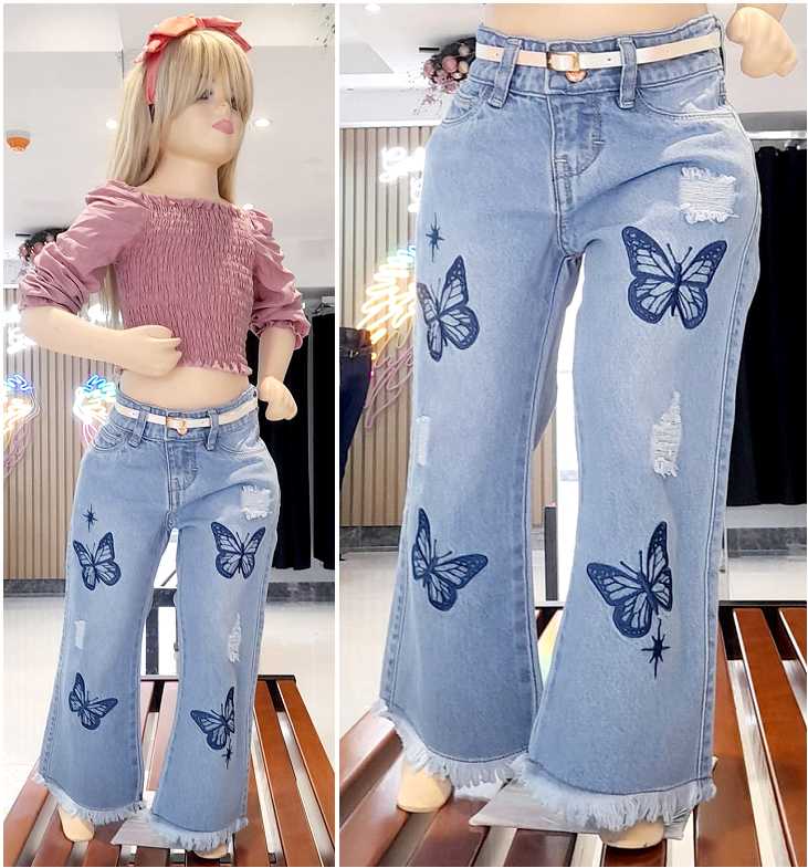 Denim rígido, diseño bordado en mariposa, alto relieve.