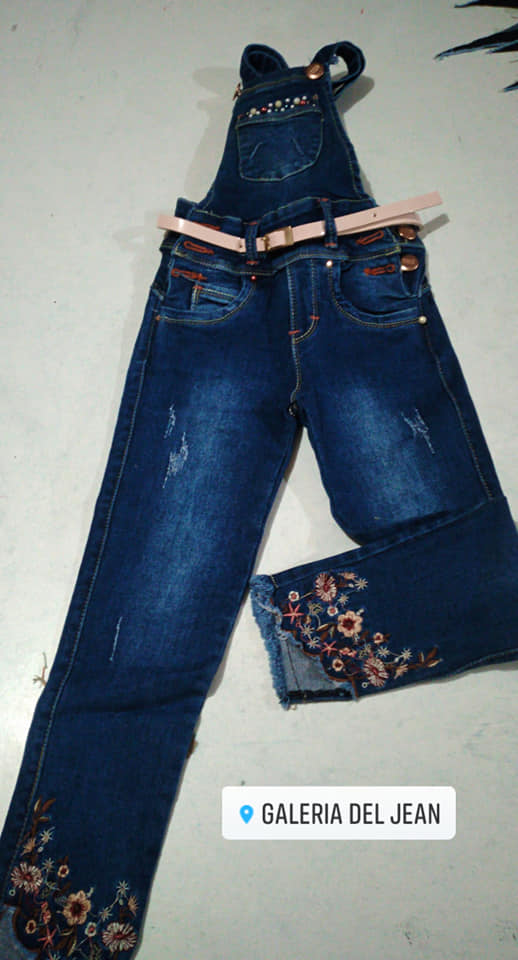Pantalón Overol, confort, basta bordada  con perlas en pechera.  Incluye correa.